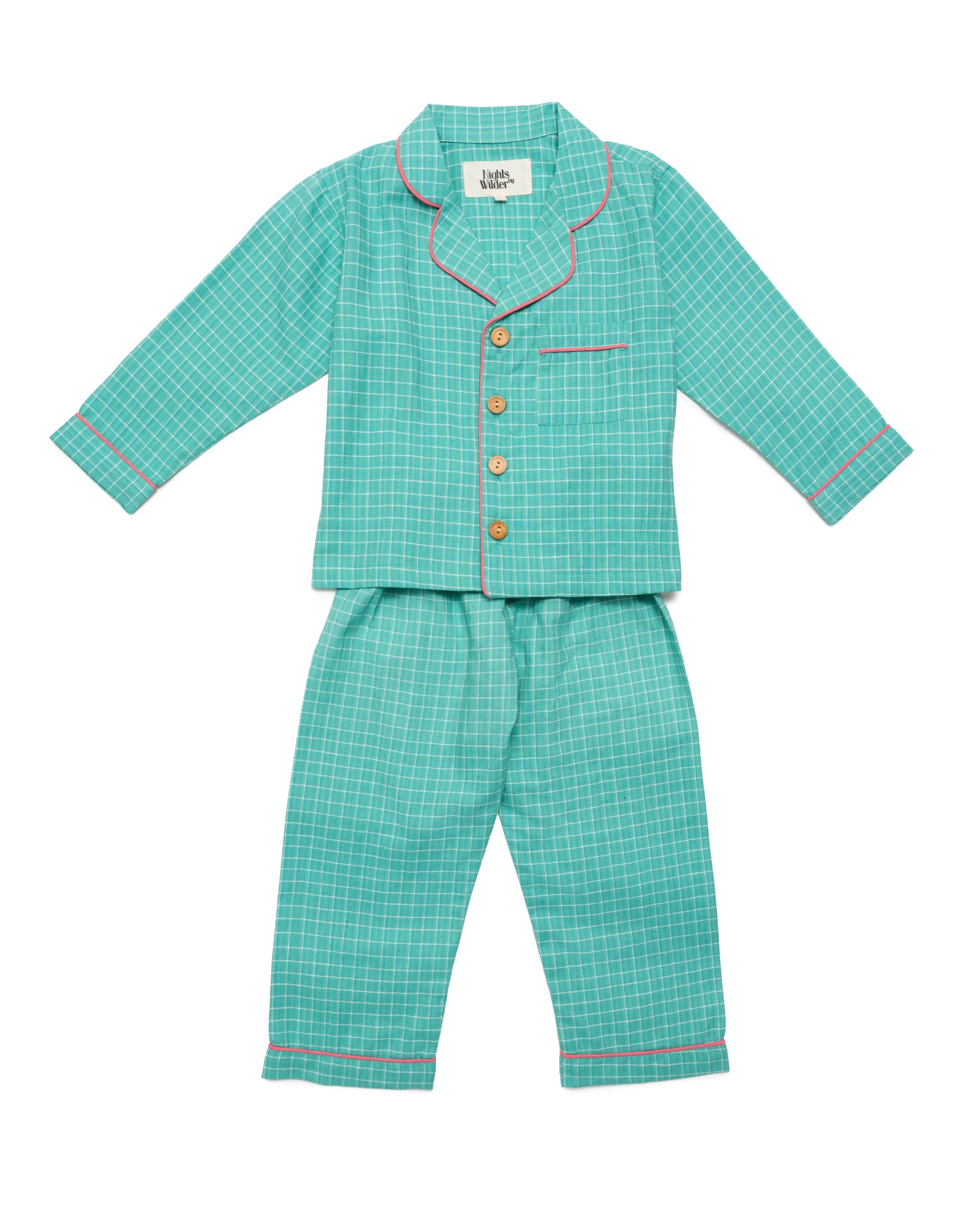 Classic unisex pyjama set made from a hand spun, turquoise check with bright pink piping. Classic button down style shirt with pockets and elasticated waist trousers for ease and comfort. Available in other sustainably sourced cottons that soften with each wash. If in doubt, size up.
