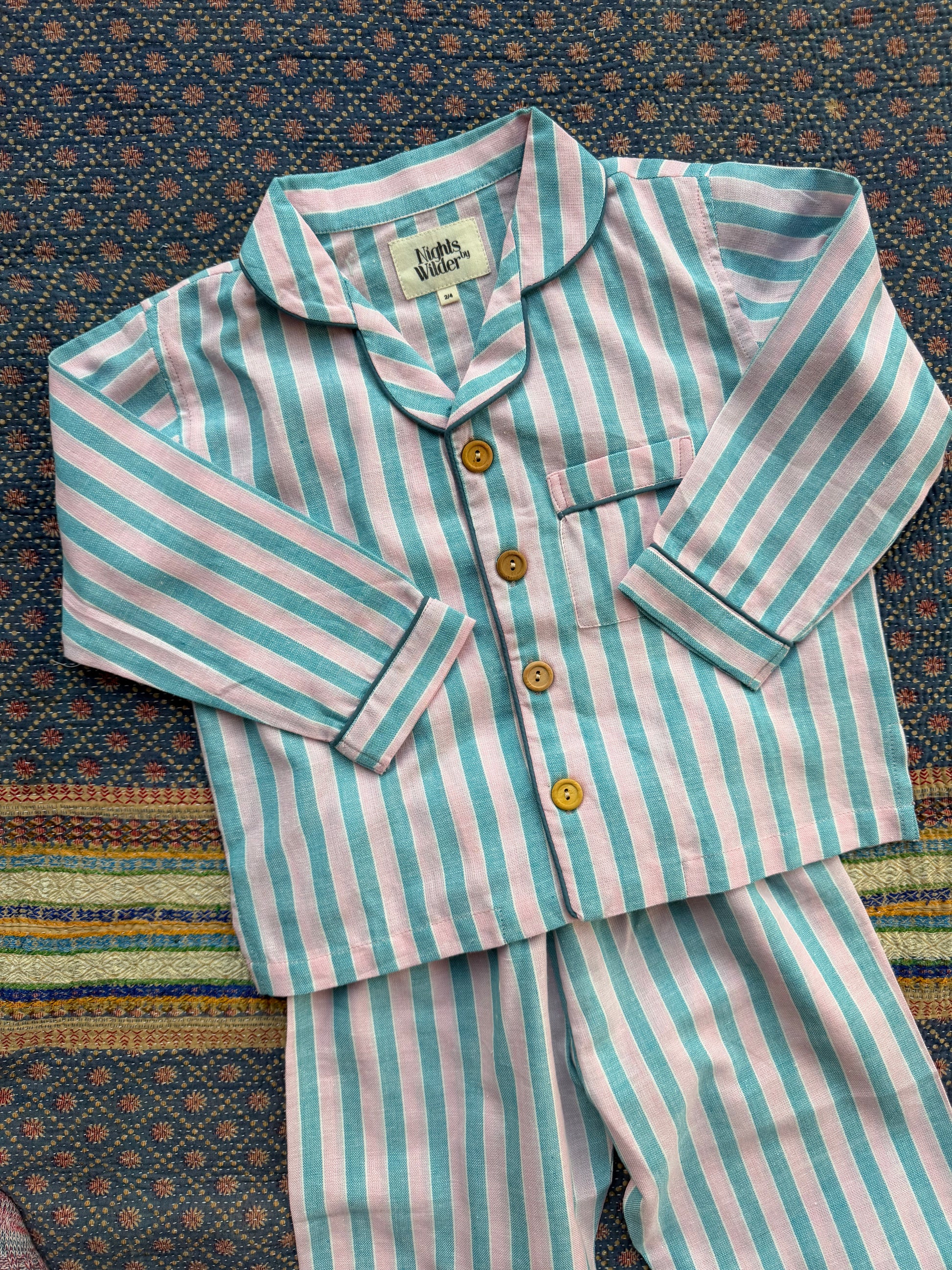 Classic unisex pyjama set made from a hand spun, pink and blue ‘Paloma’ stripe with blue piping. Classic button down style shirt with pockets and elasticated waist trousers for ease and comfort. Available in other sustainably sourced cottons that soften with each wash. If in doubt, size up.