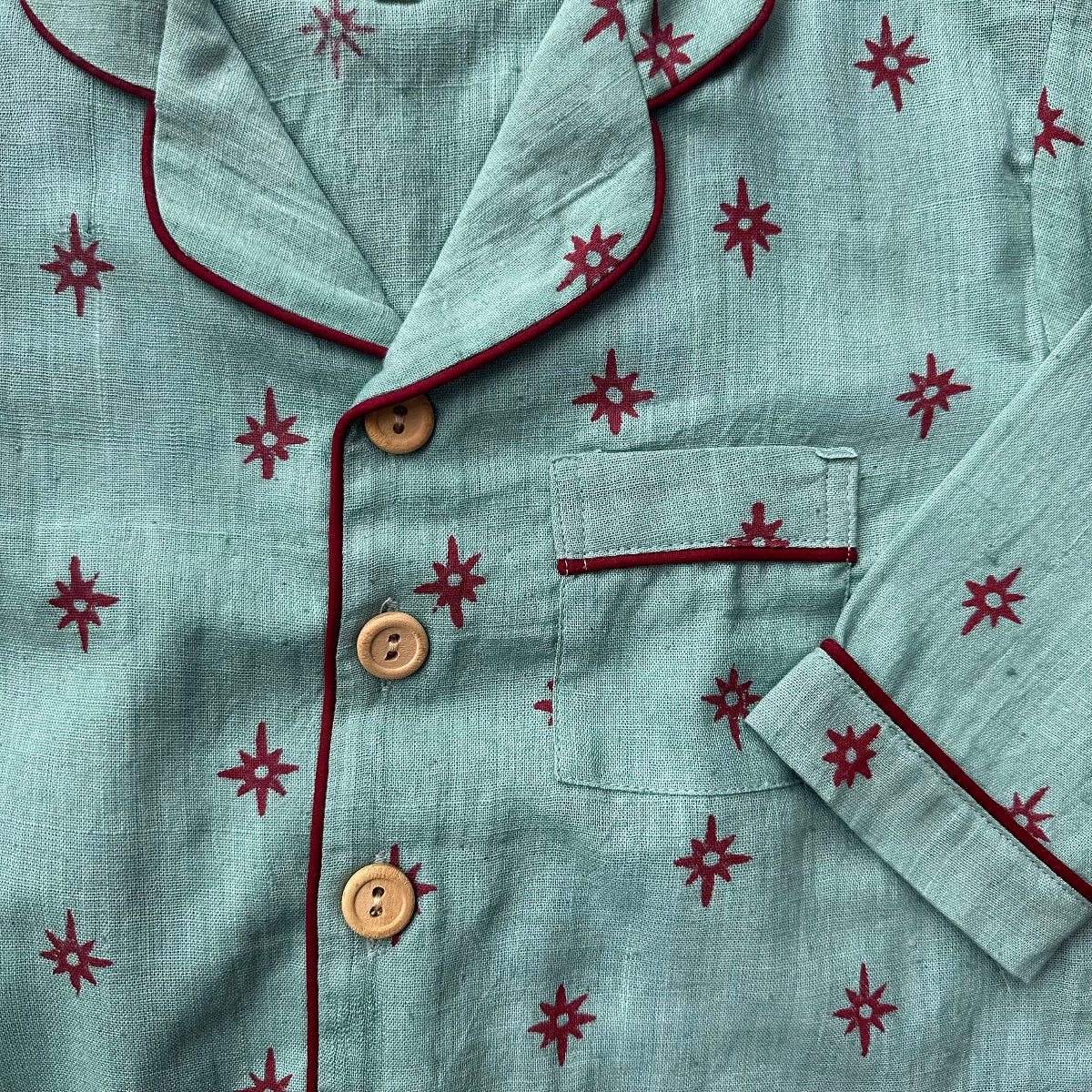 Our ‘Lennon’ classic unisex pyjama set, with button down style shirt and elasticated waist trousers for ease and comfort. Available in this new festive new Red star Stella block printed by hand in Jaipur on a bluey green background khadi cotton. Available in ages 2-4 up to 10-12 and also in Nico and Farrow styles, great for matching siblings/friends. We recommend sizing up.