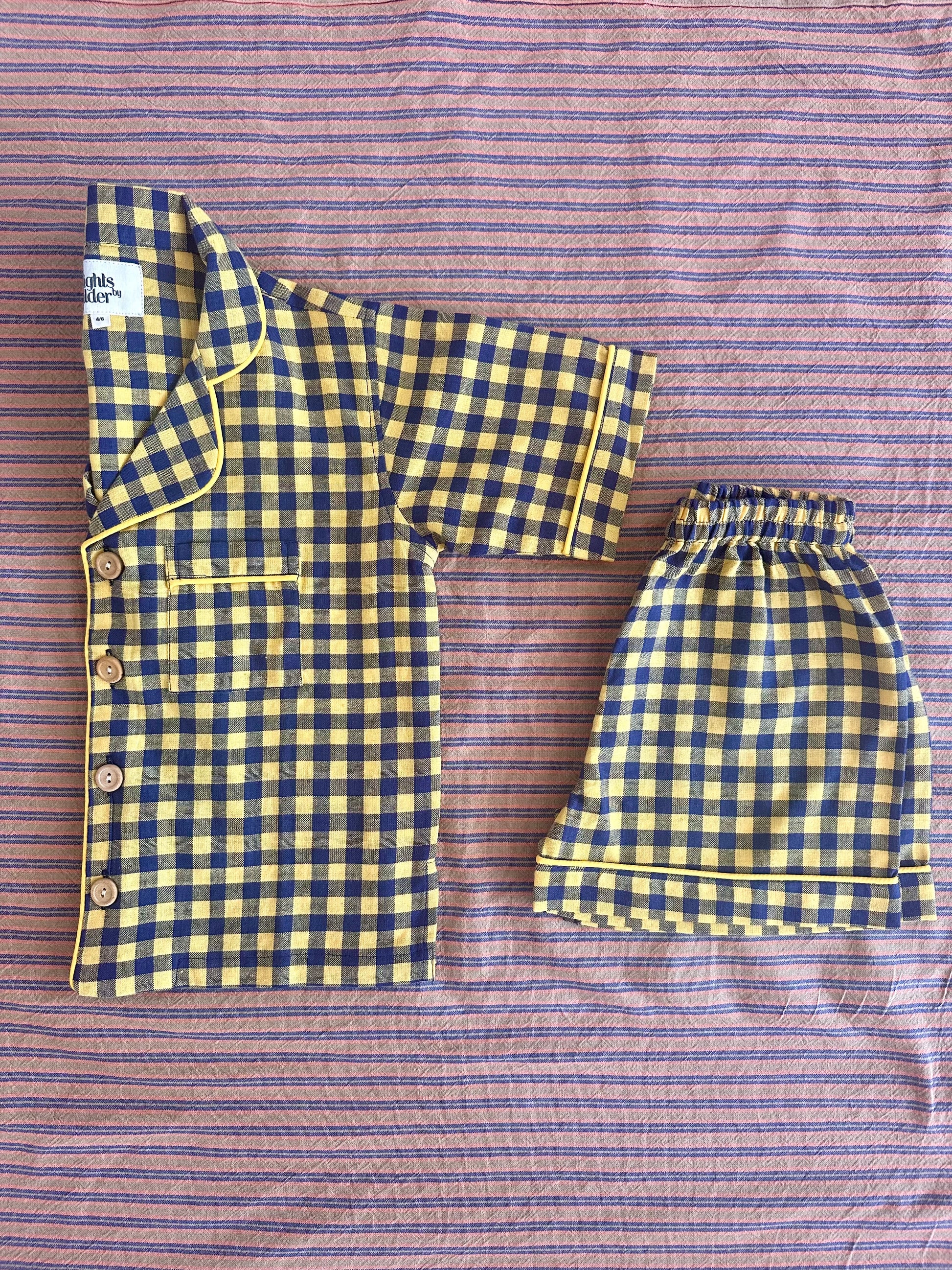A fun take on a classic check in yellow and navy this Lennon short set is perfect for warmer nights. Matched with elasticated waist shorts for ease and comfort, a set that can work on both girls or boys. This fabric is 100% handwoven, khadi cotton and made by artisans.