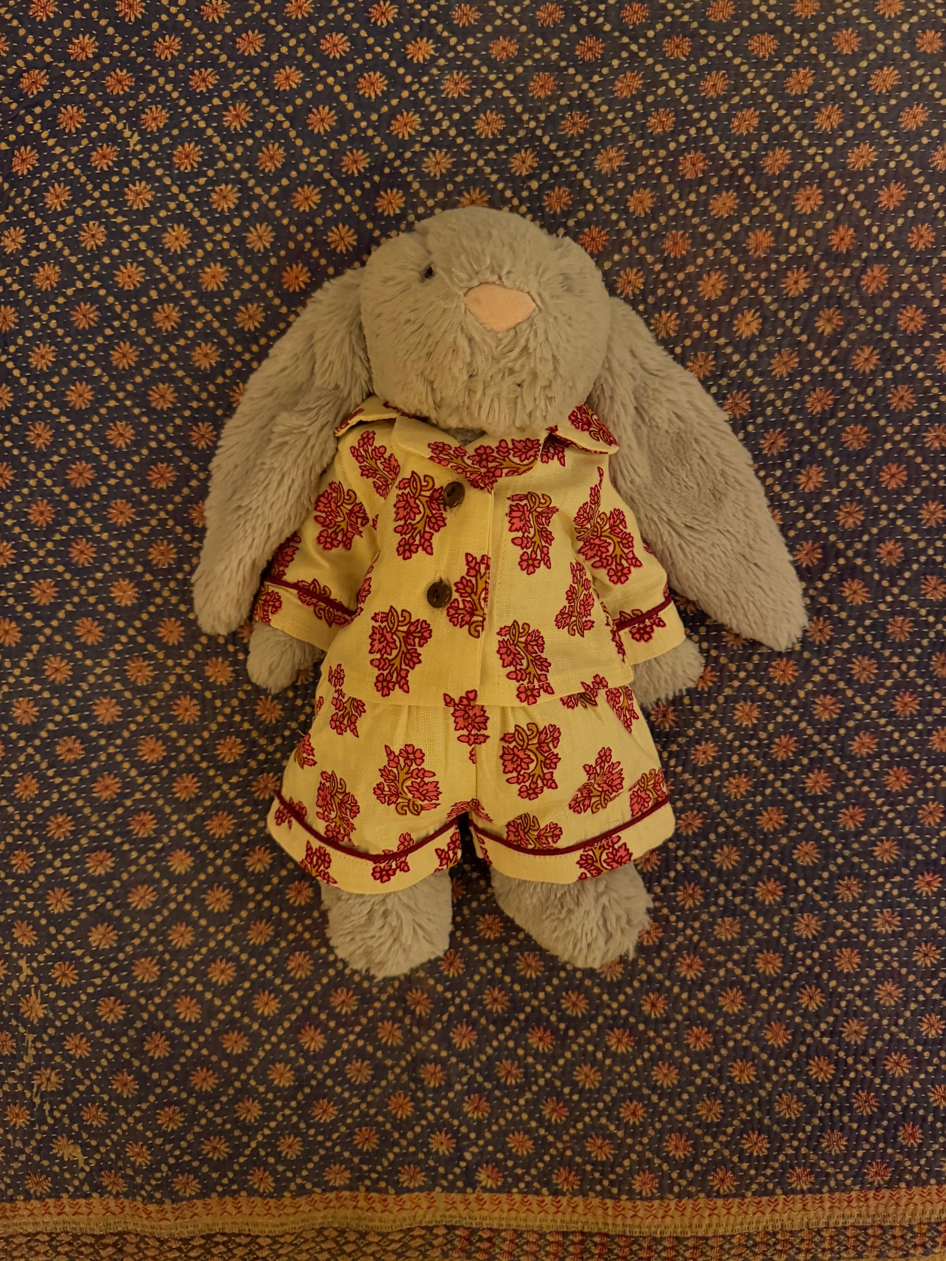 Lennon Toy Pyjamas in our classic Lennon style shirt. Made to fit 30cm Jellycat Bunnies or a teddy of a similar size. Has discreet split in the back for a bunny tail.
