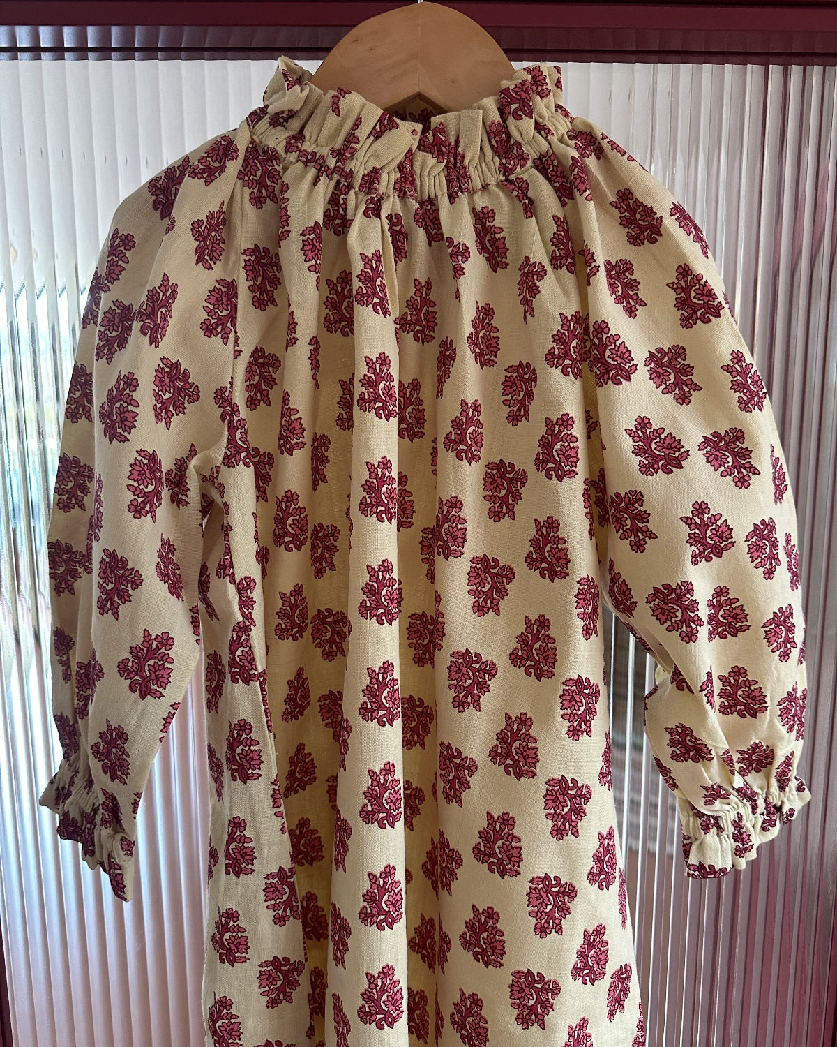 Long sleeved dress made with 100% sustainable hand printed cotton fabric in a fun pink boots floral print. The traditional shape with balloon shaped sleeves features ruffled elastic detailing on the collar and cuffs. The versatile nature of the hand spun cotton makes it perfect for both summer and winter nights.