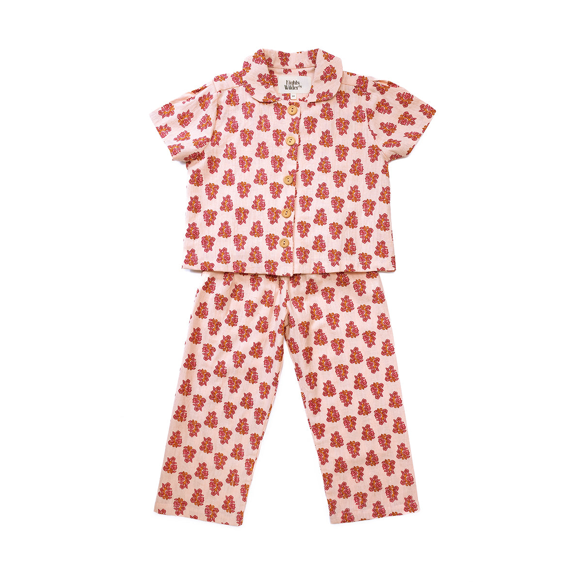 This short sleeved girls swing style pyjama set features a sweet peter pan collar with a single pleat on the back and pockets on the front. Matched with elasticated waist trousers for ease and comfort, a set that can work on both girls or boys.. This block printed folk flower is handprinted in Jaipur by artisans and is available in a few of our styles; Nico and Farrow.